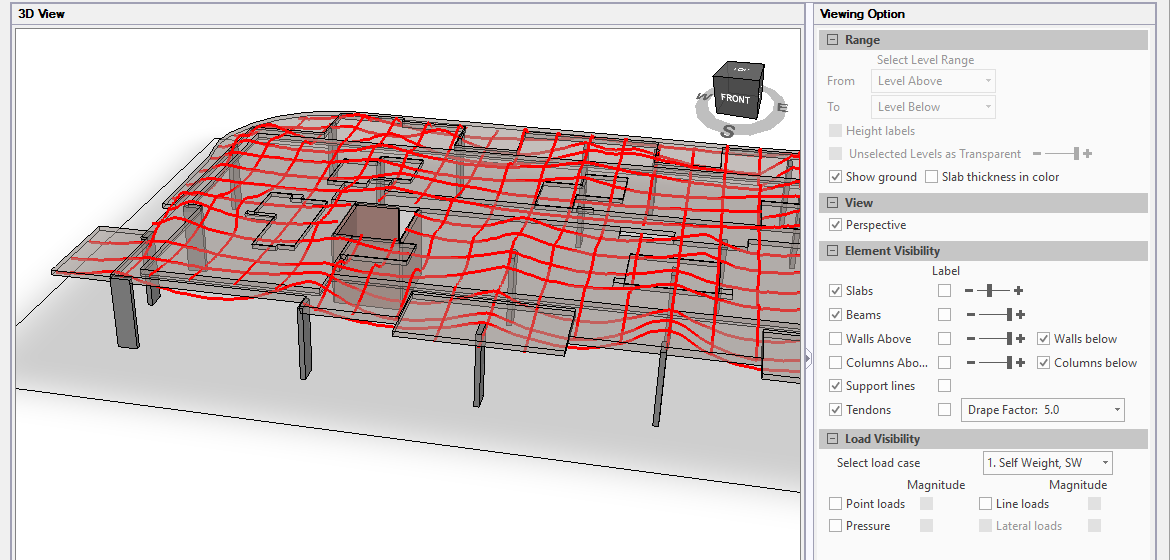 Preliminary design can be performed before laying out tendons to estimate how the slab will deflect with post-tensioning. Laying out the tendons is very fast with the tendon profiles being generated automatically based on defined high point locations and automatic generation of the design strips.
