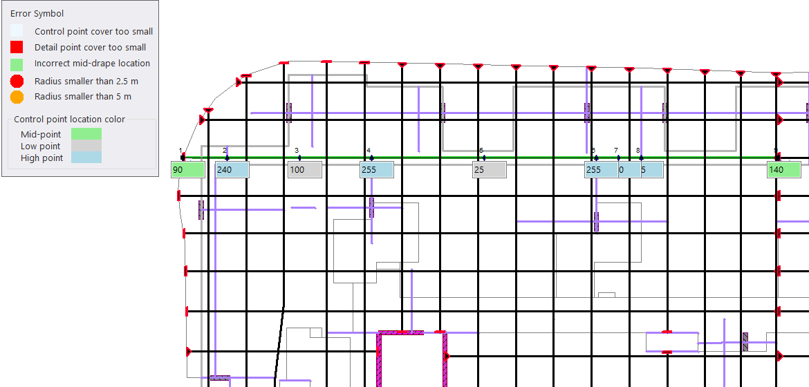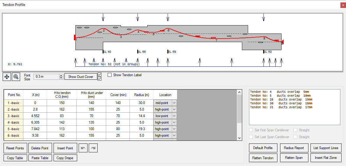 Tendons can be quickly modified in section or in plan, and minimum cover can be checked not just at the high points and low points but at the location of steps in the slab too. Tendon clashing can also be viewed in in section or in plan.