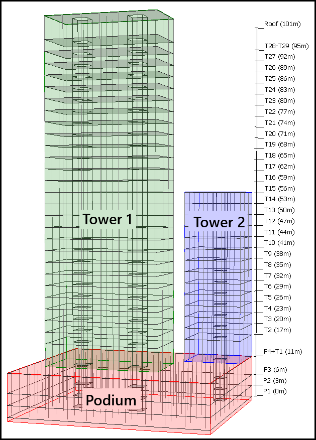 Modern developments often feature a shared podium supporting two or more towers. In these Multi-Tower buildings, each tower can behave very differently under lateral loads dynamically due to variations in height, stiffness, and geometry. As a result, static Earthquake and Wind forces must be evaluated and distributed carefully for each tower and the podium structure.