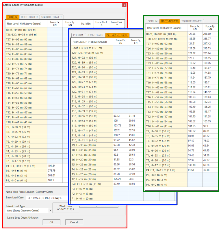 Earthquake and Wind loads can be assigned automatically to each tower and podium.