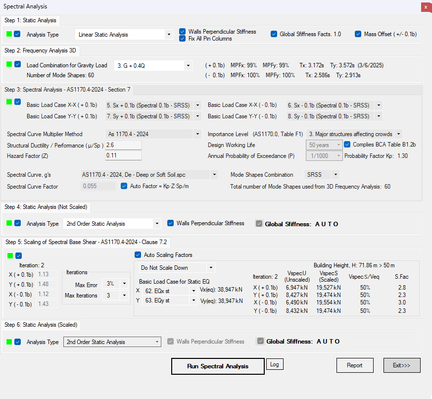 RCB includes a fully automated Spectral Analysis with Auto Scaling. The Spectral procedure consists of six steps executed in sequence. The Spectral Scaling uses a proprietary interactive algorithm when stiffness reduction factors based on AS3600, Table 6.2.4, are applied.