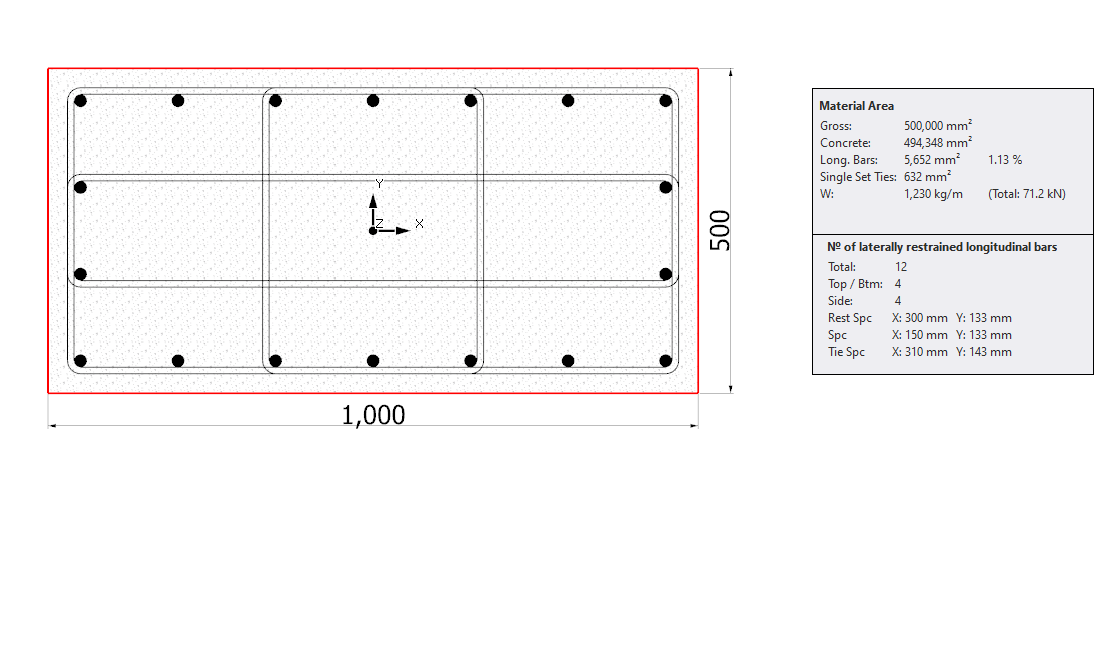 Transverse reinforcement is automatically detailed. RCC checks any requirements for the number of legs, transverse spacing and longitudinal spacing. Any relevant code requirements for transverse reinforcement such as restraint, core confinement, detailing for seismic design are automatically considered by the software.