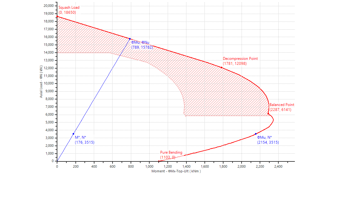 RCC automatically plots the moment-axial interaction diagram and shows loading lines and the special confinement zone (AS3600) if applicable.