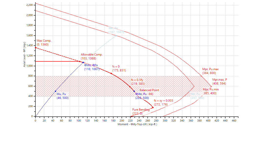 Both orthogonal directions are checked as are both sides (top and bottom) of the column. The moment – axial load interaction diagram(s) are automatically calculated, as is the column’s capacity under ultimate and fire loads considering slenderness and moment magnification as applicable.