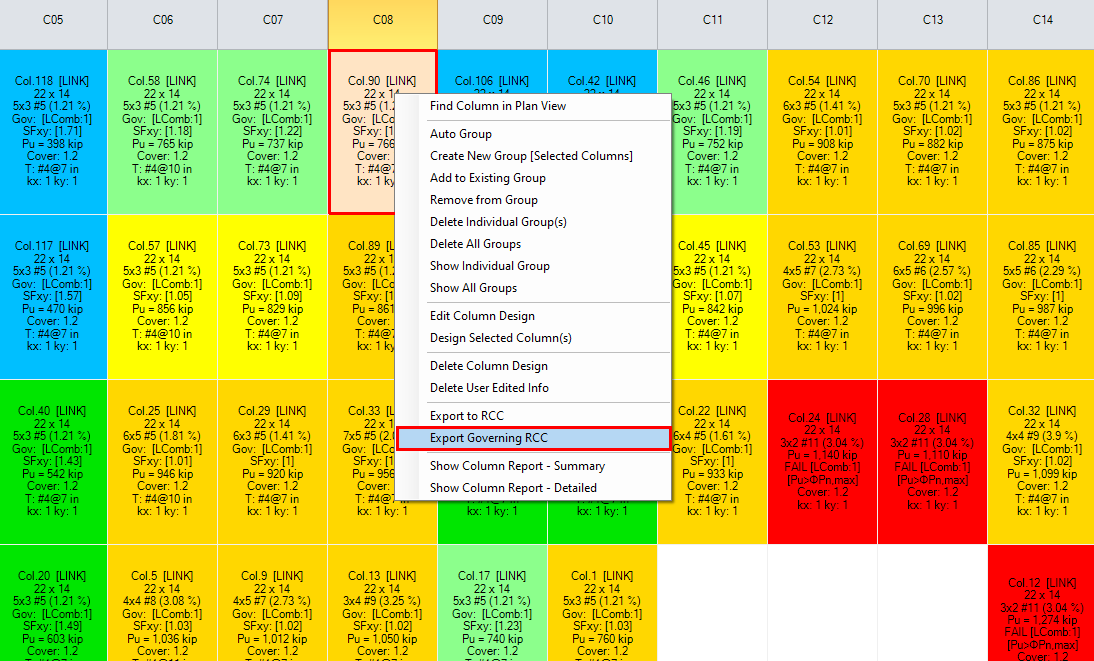 If shear force is present, one-way beam shear checks are performed per direction, per side of the column. Transverse reinforcement spacing is automatically adjusted, or user input values checked.