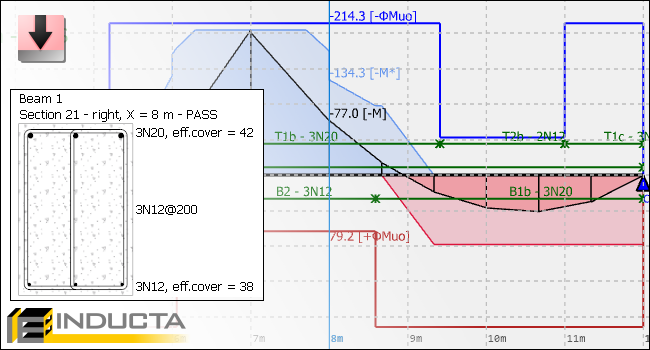 The beam design module can be used to design longitudinal steel and ties for shear and torsion for ordinary beams (SLB) and band beams (SLB, PTD). Each beam section is designed separately considering the calculated force envelope, minimum moment requirements and any additional longitudinal tensile forces caused by shear and torsion. Results are tabulated and displayed graphically as either concise or detailed outputs. A detailed report can be produced per beam section showing the entire calculation procedure.