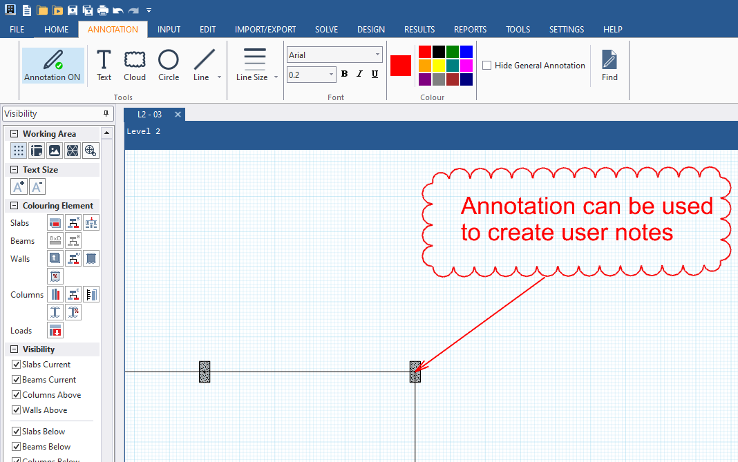 This tool will create a set of general notes associated with the model geometry, which will be shown irrelevant of the current results shown, and a set of notes related to an individual set of results. This tool can be used to write some specific comments, and remarks during development of the model, and also the notes can be used as a means of communication between different engineers working on the same model. There is a speciality Annotation management tool, which allows easy and quick overview of all notes associated with a particular model.